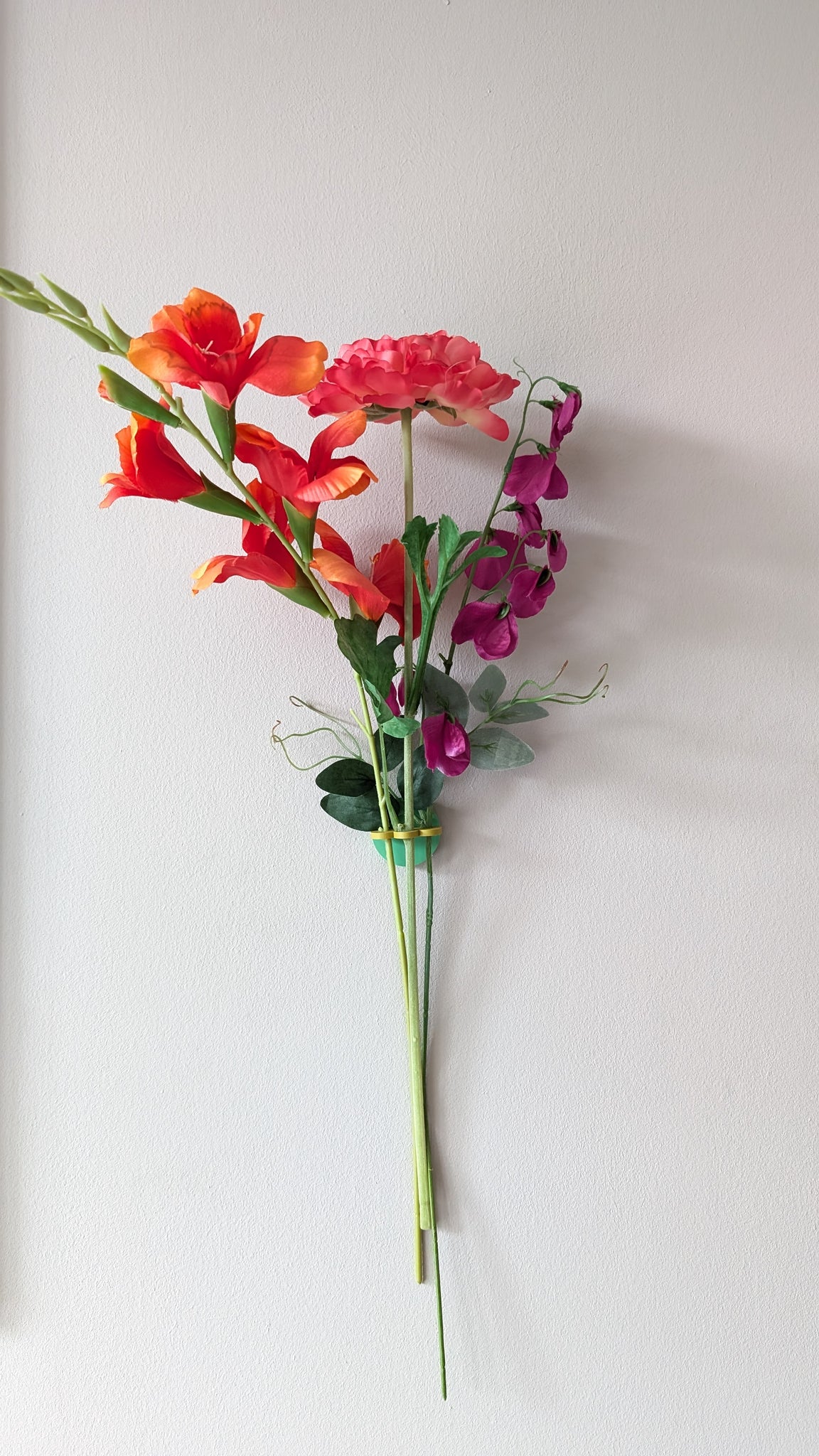 De kunstbloemschakel van Muuss klik je eenvoudig in de basishouder waarmee je de mogelijkheid creëert om kunstbloemen aan de muur op te hangen. In de schakel zitten 3 verschillende formaten gaten (diameters van 5, 8 en 12mm) zodat voor zowel dunne als dikkere stelen plek is.